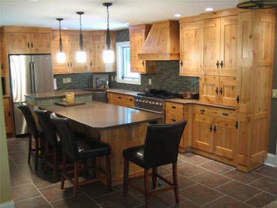 Converted the existing kitchen, dining room and family room to create one large space for entertaining. The cabinet faces are knotty alder wood giving the kitchen a western feel. The countertops are quartz, similar to granite but with no maintenance. The entire area is tiled. Beneath the tile is an under floor heating system that allows the homeowner to control the floor temperature by a thermostat.